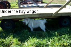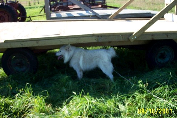 We do farm setting several times a year and these seem to be the happiest times for him. He would be out in the country with another (better behaved) dog and be tied out in the open where he could see in all directions. He really enjoyed playing with his pal "Lucy" and touching noses with the horses when he got a chance. Some times he would get a long walk down to the fish pond and often tried to pull in that direction any other time. Sometimes he would hop up on the hay wagon and look around with excitement and alertness at all the sounds and movements. At home, he would often want to come in the house at night but on the farm, he'd just as soon stay out in the field all night and bark at all the critters moving around.