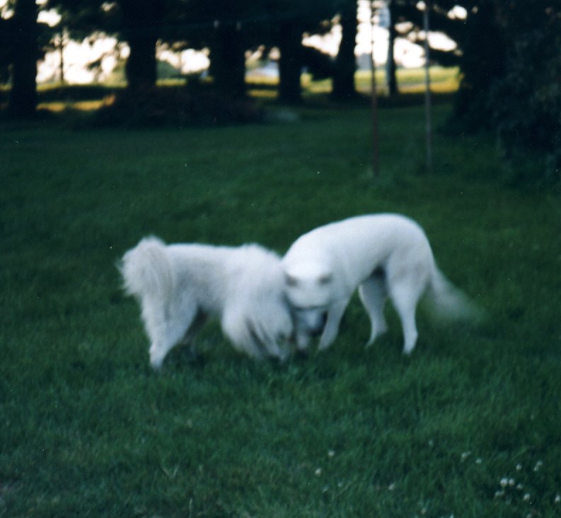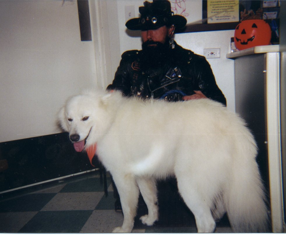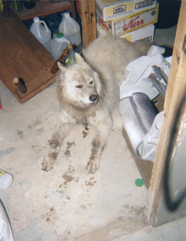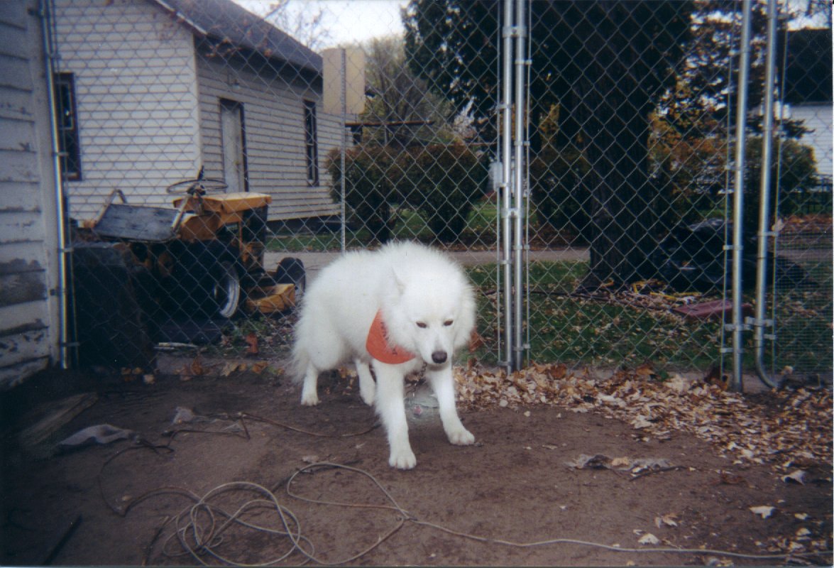 He was terribly afraid of thunder and lightening. So afraid, he usually had to be tranquilized during storms. If alone in his kennel when a storm approached, he would tear through the chain-link fence and run. A few years back, he was having a lot of medical problems and had to get an X-ray taken. The vet pointed out that at some time in his past, he had been shot with a shotgun and still had a pellet in him. We assume that this is probably where his intense fear of thunder came from. During the 6 years I had him, I only had to bail him out 2 of the 15 + times he escaped. Either he would finally get tired of running and get into my car when I found him or come home himself. If the Weyauwega police picked him up, they would bring him home first instead of to the pound so long as someone was home to take him.